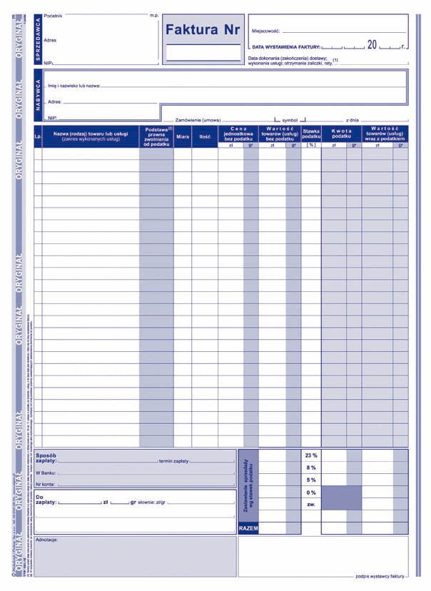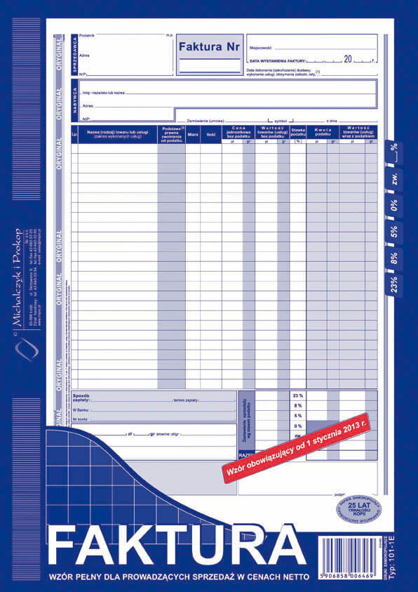 | zastosowanie: | faktury i inne dokumenty wynikające z przepisów o podatku od towarów i usług |