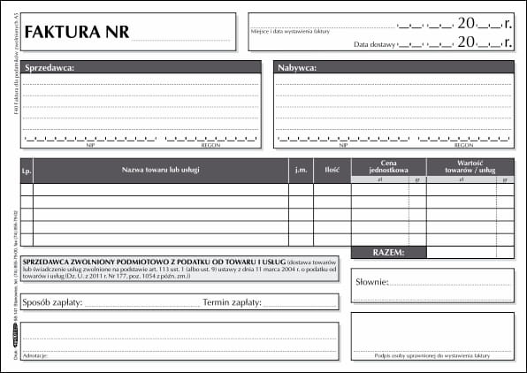 Faktura dla podatników zwolnionych podmiotowo z podatku od towarów i usług VAT.