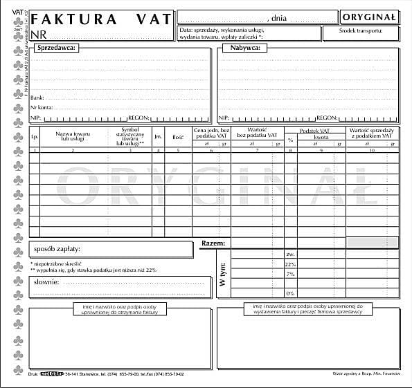 Faktura VAT 2/3 A4 oryginał + 1 kopia