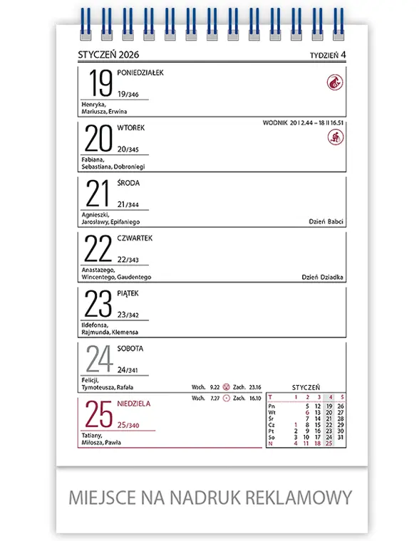 Klasyczny, 2-kolorowy kalendarz biurowy stojący. Kalendarz na biurko. Podstawka ze sztywnego kartonu formowana w stojak o profilu trójkątnym.