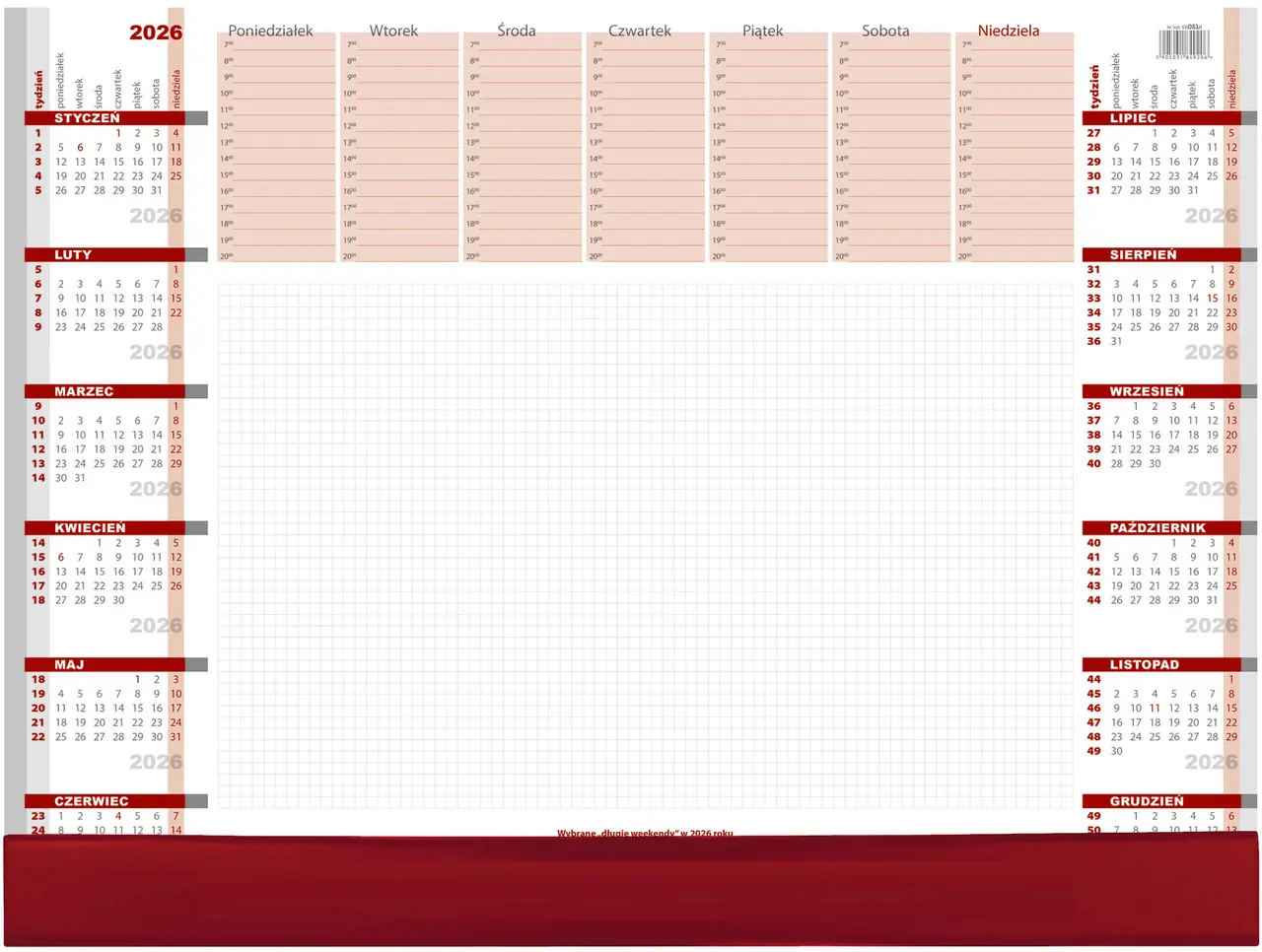 Praktyczny podkład na biurko z dużym obszarem do notowania, drukowany na papierze białym. Uchylna listwa PCV w kolorze bordowym w dolnej części kalendarza.