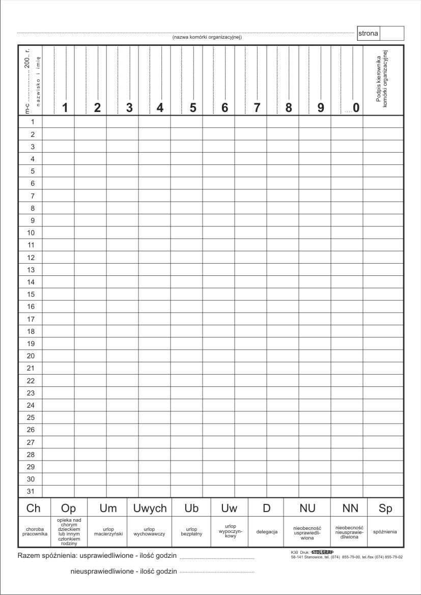 Druk lista obecności pracowników.